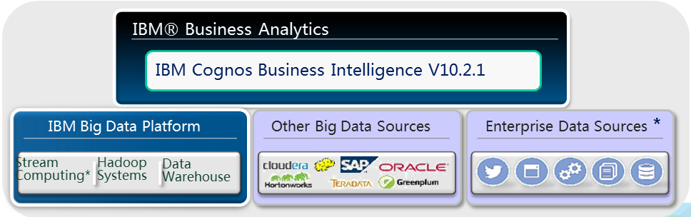 IBM Cognos BI V10.2.1(IBM Cognos Enterprise的核心产品)带来了交互式可视化、移动BI、性能增强和大数据支持等能力上的提升。